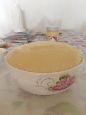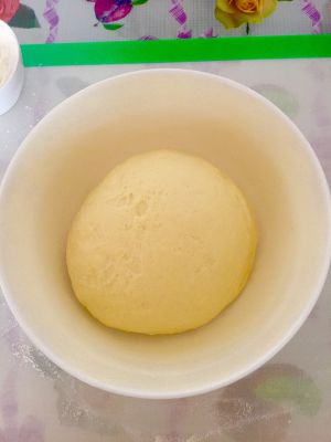然后将面团放入碗中进行发酵。碗事先抹上黄油防止黏连。