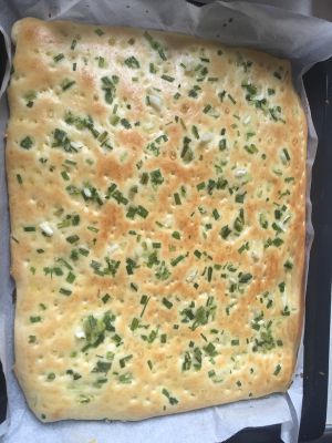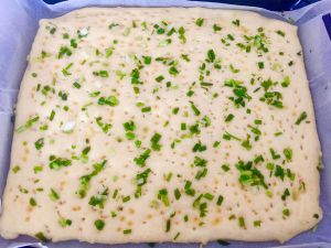 发酵好后,将面饼上用牙签戳上排气的洞洞,涂上蛋液,撒上葱。蛋液中我加了适量的盐。