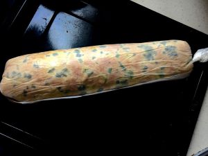 材料放好后,将面饼卷起来,卷法就像卷寿司一样,一定要卷紧,然后将两边包好,如图示。放一旁冷却。