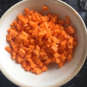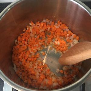 用小火待油温热后倒入蒜末,洋葱翻炒数秒后倒入胡萝卜翻炒至香味冒出.