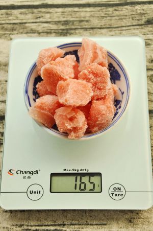 称取西瓜165克,切块放入冰箱冷冻,制成冰块。