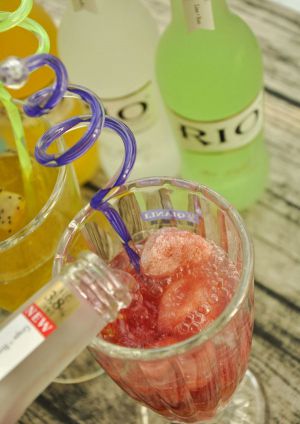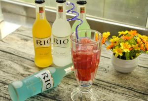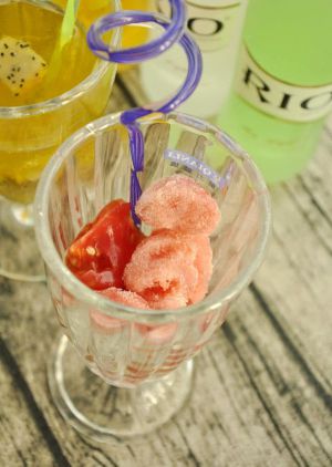 将RIO锐澳鸡尾酒后倒入放有西红柿和西瓜冰块的冰饮杯里。