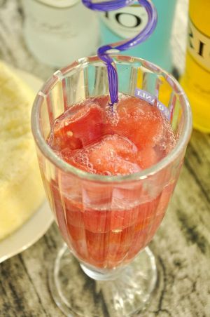 将冷藏好的西红柿和西瓜冰块放入冰饮杯中。