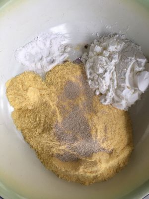 玉米面跟玉米淀粉3:1比例放,加小苏打,酵母混合
