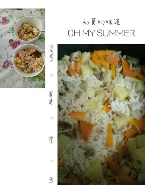 电饭煲米淘后,放入适量的水,把扁炒好的五花肉,土豆,胡萝卜倒入电饭煲中