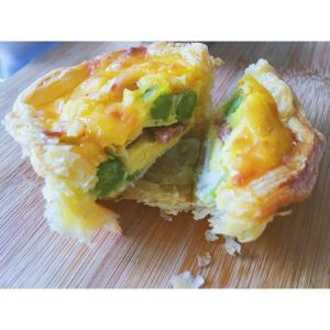 打入一个鸡蛋或鹌鹑蛋 放入培根碎片和几颗青豆粒 我用的鸡蛋 但是只放了一点点蛋白液 加入盐胡椒粉调味