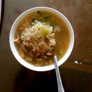 炒好后倒入大米锅内 稍煮片刻 米熟放入葱花出锅