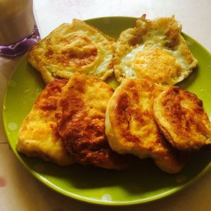 馒头切片、然后放入搅拌好的鸡蛋液滚一下