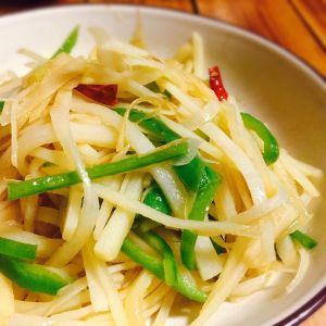 放入土豆丝,大火快炒1分钟,加入盐和一点点生抽。