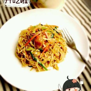 过完冷开水的面跟配菜一起翻炒,加酱油,生抽,加点点盐(根据自己口味放)拌匀,最后放葱、香油炒下出锅