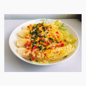 锅里放点油,把蒜末放进去炒一会,变色后盛出摆在娃娃菜上。