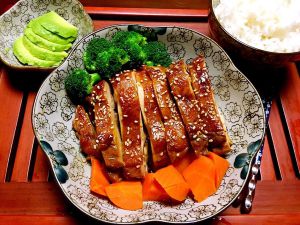 斩块撒芝麻,蔬菜开水煮三分钟捞出做配菜,营养更均衡