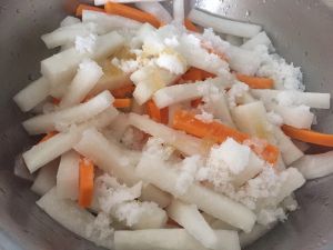 切好的萝卜条撒一层盐加入一些萝卜再撒一层盐再加入萝卜再撒一层盐直到所有萝卜撒完盐腌制一个小时,中间会腌制出很多水,将水倒掉