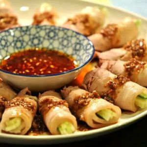 黄瓜切丝,将切片的五花肉裹上黄瓜丝摆成一圈,淋上调料,撒上葱花。