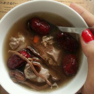 茶树菇提前半小时泡发好,排骨加水入锅煮开,放入茶树菇、红枣、枸杞