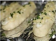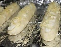 把八个小挤子揉成长条,压扁(我的烤箱不大,一层之能烤4条,装了两盘哈哈),继续入烤箱,调38度,底下装一盘开水,这样保持温度和湿度,让面包挤子保持稳定的湿润环境发酵,一个小时)