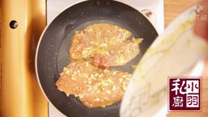 ▲平底锅倒油,油热后转小火,放入腌好的鸡胸肉和剩下的酱汁,盖上锅盖稍微焖一下。