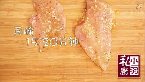 ▲将调好的酱料均匀的涂抹到腌好的鸡肉上,再腌上15-20分钟,让鸡胸肉腌入味,或者你裹好后直接放到冰箱里,腌过夜,第二天拿出来直接煎就好了,这样可以更加入味。