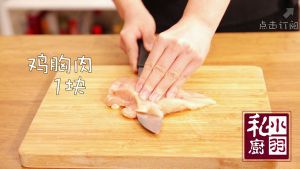 ▲先把鸡胸肉从中间片成两片,这样薄一点,才容易腌入味。