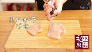 ▲把片好的鸡胸肉两面都均匀的撒上盐、和黑胡椒碎,盐可以适量的多放一点,因为之后加入蜂蜜后可能会冲淡咸味。