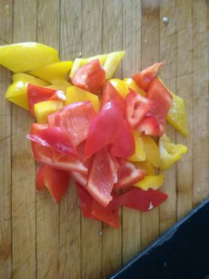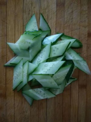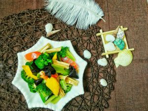 把红黄椒,和西兰花,芹菜,木耳,腐竹,黄瓜放在一起,加一勺盐,半勺味精,适量鸡粉,少量香油,拌匀