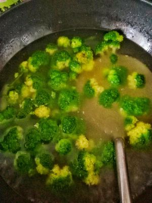水烧开后,加适量盐,一勺油,先焯芹菜,大约一分钟;再焯木耳和腐竹,也焯一分钟,最后焯西兰花,变色后捞出