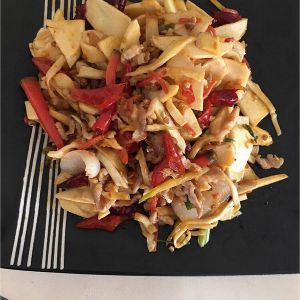 热锅下油放花椒粒炒香,放入肉丝变色后放姜蒜、泡椒爆香,放笋子、豆皮翻炒,笋子炒熟放盐、鸡精出锅