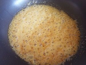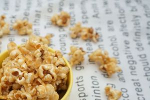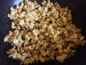 倒入爆米花,迅速搅拌,让每一粒爆米花都能沾上焦糖。