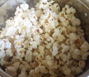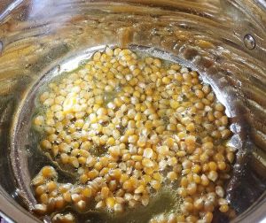 盖上盖子,听到噼里啪啦的声音时,玉米粒就开始变成爆米花,要不时晃一晃锅,让玉米粒受热均匀,锅里声音消失后,玉米粒全都变爆米花,即可关火。