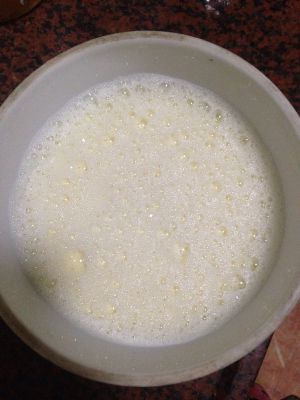 最后一步就是全部材料都加完之后就继续打发,打发到像我这样的要有很多大泡泡,泡泡越多越好,泡泡不用过滤,就这样炖就可以炖出水嫩嫩的鸡蛋啦。