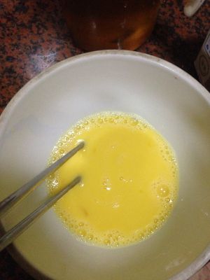 用筷子或者手动打蛋器将鸡蛋打发这样,