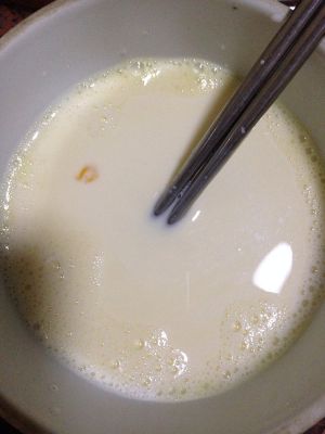 最后就是把一瓶250ml的牛奶加入蛋液中。(如果你不喜欢牛奶的话这里就可以换成凉开水,两个鸡蛋用一碗水就够了)