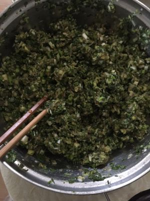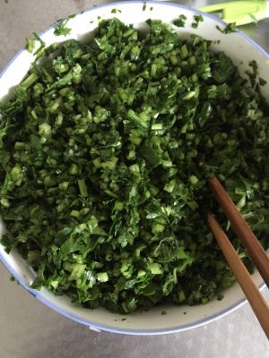 西芹剁碎,越碎越好,放盐腌20分钟,挤出水分,适当即可
