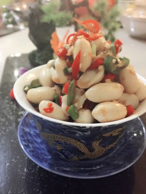 第二步:青红小米椒切成圈,香菜切成沫,放入白糖,味精,东古酱油,辣鲜露,水塔陈醋,蚝油,生抽调味