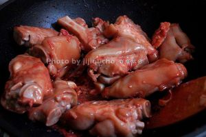 加入猪脚及3匙料酒、冰糖爆香。步骤
