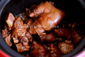 当中要注意观察粘底可水烧干,如果时间到后水还太多,可以开锅进行收汁。只要蹄子熟透变软就可以,不要炖得太过酥烂。