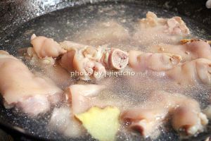 买来的蹄子要先处理一下,看有没有猪毛要自己拔干净,然后浸泡在清水中,泡去血水。没过蹄子凉水开火,加入半块姜,3匙料酒,煮开