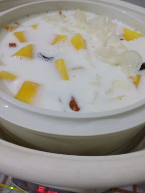 除了牛奶最后加,其他材料一锅熟,放适量水炖60分钟左右!因为木瓜在炖的过程中会产生水份,所以关键就是不要放太多水来炖!
