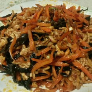 煸出红油放胡萝卜丝,多炒一会,颜色变深放木耳,酱油,糖,少许水,闷一下