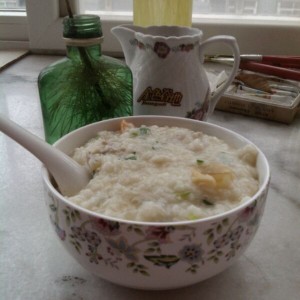煮几分钟后放入一个瓷勺子,这个是个小秘诀哦!会让粥更细滑