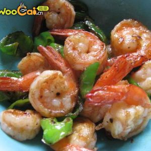 青椒切成小块,放进锅里稍微煎炒,半熟时加入虾球翻炒,加入酱油,再拌炒两下即可出锅。