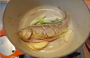 锅中放油烧滚热后,放入黄鱼两面煎至微焦,加入生姜及大葱段一起煎香;