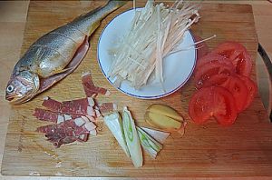 黄鱼剖杀清洗干净,擦去水分,两面各划3刀,均匀抹上少许盐腌制;火腿、生姜切薄片,大葱切段,金针菇撕开,蕃茄开水烫一下去皮切成片;