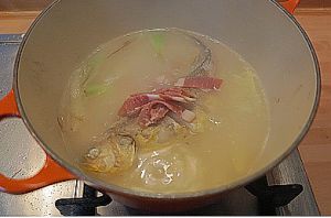 加入足量热水没过黄鱼,同时加入火腿片盖上锅盖中火煮5分钟,