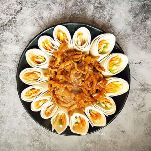 炒好的肉丝放在摆好的豆腐皮上就可以享用美味啦。