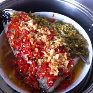 两边放上剁椒和刚才炒好的蒜粒。上锅蒸十二分钟。