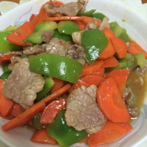 热好油,按顺序下胡萝卜,肉片,青椒翻炒,加少量水,起锅前放盐、鸡精调味