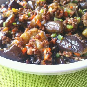 锅中倒油,放入拧过水的茄子翻炒,再放入之前的肉末翻炒均匀,盖上锅盖中火烧制,中间多翻炒几次以免糊锅。