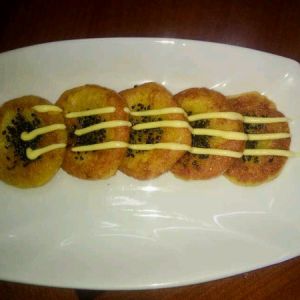 热锅。下南瓜饼,煎至两面金黄,盛出。
