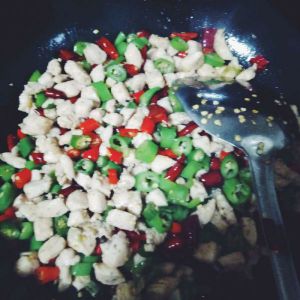 把之前炒好的鸡丁倒进去,混一起,炒一会。一般这个时候就不用再放盐了,放一点鸡精调味,就好了。
